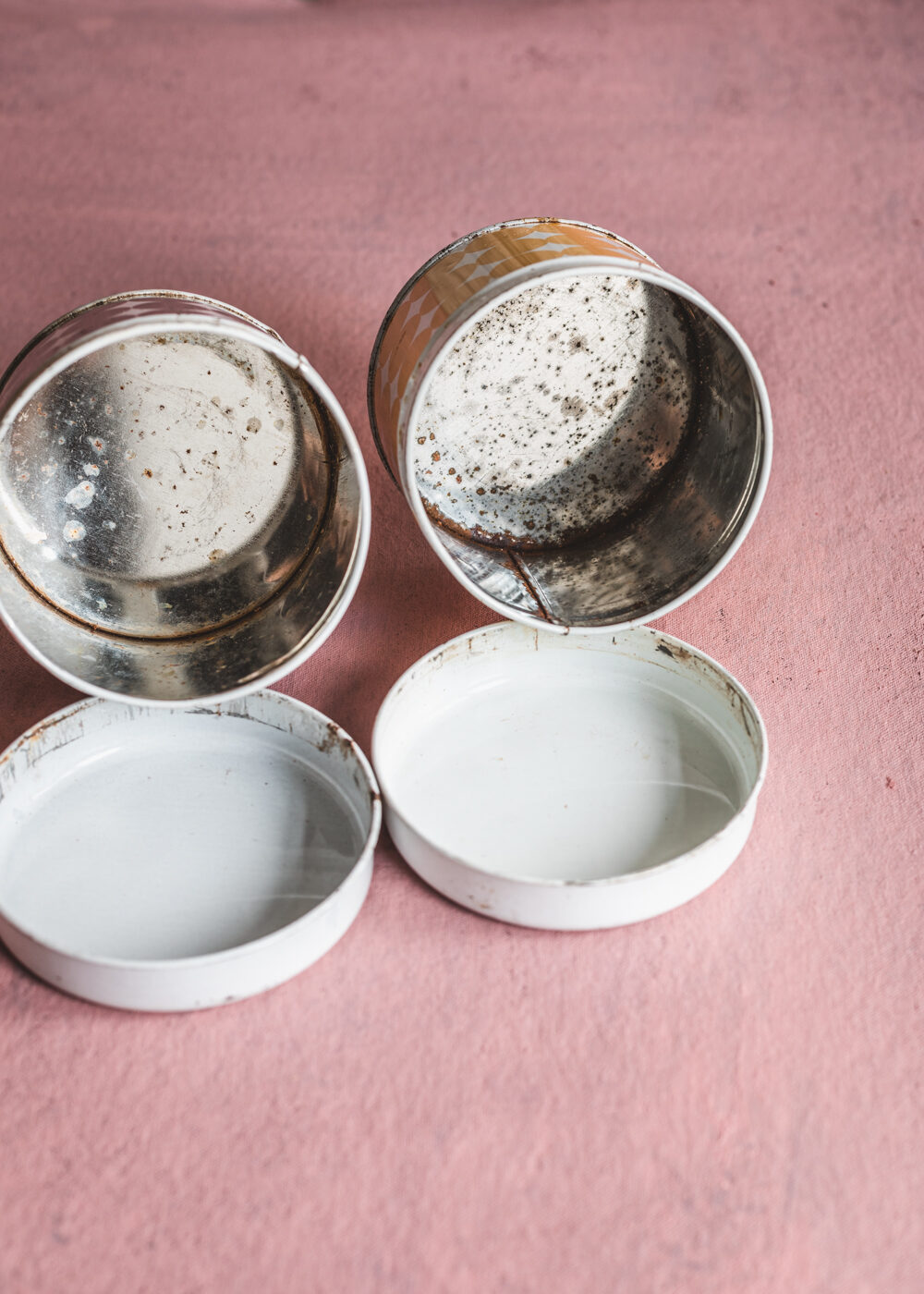 Iloisen kirjavat keltainen ja ruskea Savoy-peltipurkit. Purkit sisältä kuluneet, hieman ruostetta.